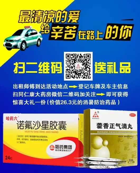 山西同仁康大藥房太原市與孝義市各藥房在7月7日--9日為“的哥、的姐”送上我們***真摯的祝愿,我們?yōu)槟呐谥屏讼顩霾韫┠赓M(fèi)飲用。并且現(xiàn)場掃碼即可獲贈價(jià)值26.3元的消暑防治藥品(天士力集團(tuán)的藿香正氣滴丸和哈藥集團(tuán)的諾氟沙星膠囊),同時(shí)現(xiàn)場還免費(fèi)贈送您價(jià)值5元的優(yōu)惠券四張,持此券您可在山西同仁康各藥房特惠購藥。